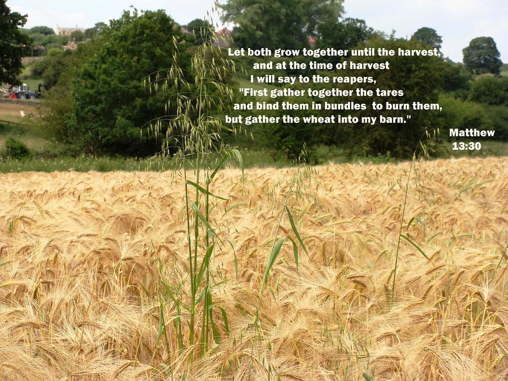“耶稣又设个比喻对他们说:天国好像人撒好种在田里,及至人睡觉的时候,有仇敌来,将稗子撒在麦子里就走了。到长苗吐穗的时候,稗子也显出来。田主的仆人来告诉他说:主啊,你不是撒好种在田里吗?从哪里来的稗子呢?主人说:这是仇敌做的。仆人说:你要我们去薅出来吗?主人说:不必,恐怕薅稗子,连麦子也拔出来。容这两样一齐长,等着收割。当收割的时候,我要对收割的人说,先将稗子薅出来,捆成捆,留着烧;惟有麦子要收在仓里。”(太13:24-30)