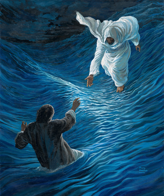 耶稣说:你来吧。彼得就从船上下去,在水面上走,要到耶稣那里去;只因见风甚大,就害怕,将要沉下去,便喊着说:主啊,救我!”(14:29-30)
