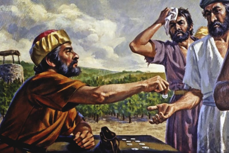 “因为天国好像家主清早去雇人进他的葡萄园做工,和工人讲定一天一钱银子,就打发他们进葡萄园去。约在巳初出去,看见市上还有闲站的人,就对他们说:你们也进葡萄园去,所当给的,我必给你们。他们也进去了。约在午正和申初又出去,也是这样行。约在酉初出去,看见还有人站在那里,就问他们说:你们为什么整天在这里闲站呢?他们说:因为没有人雇我们。他说:你们也进葡萄园去。到了晚上,园主对管事的说:叫工人都来,给他们工钱,从后来的起,到先来的为止。约在酉初雇的人来了,各人得了一钱银子。及至那先雇的来了,他们以为必要多得;谁知也是各得一钱。他们得了,就埋怨家主说:我们整天劳苦受热,那后来的只做了一小时,你竟叫他们和我们一样吗?”(20:1-12)