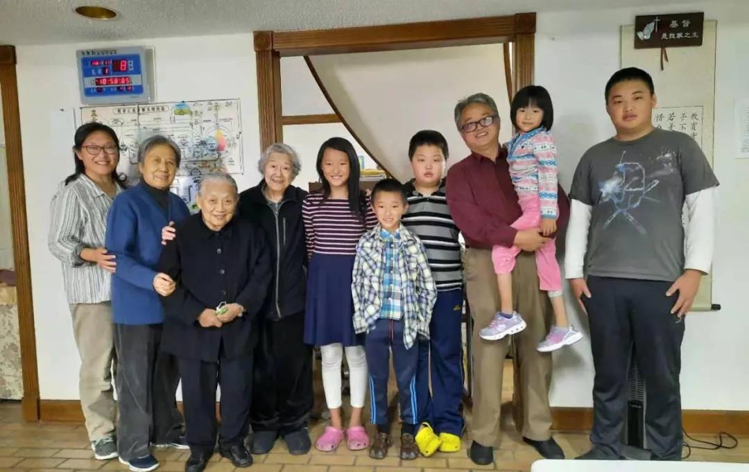 作者(右3)与师母牟韶华(左1)率5个子女探访恩典院长者(左2-4)