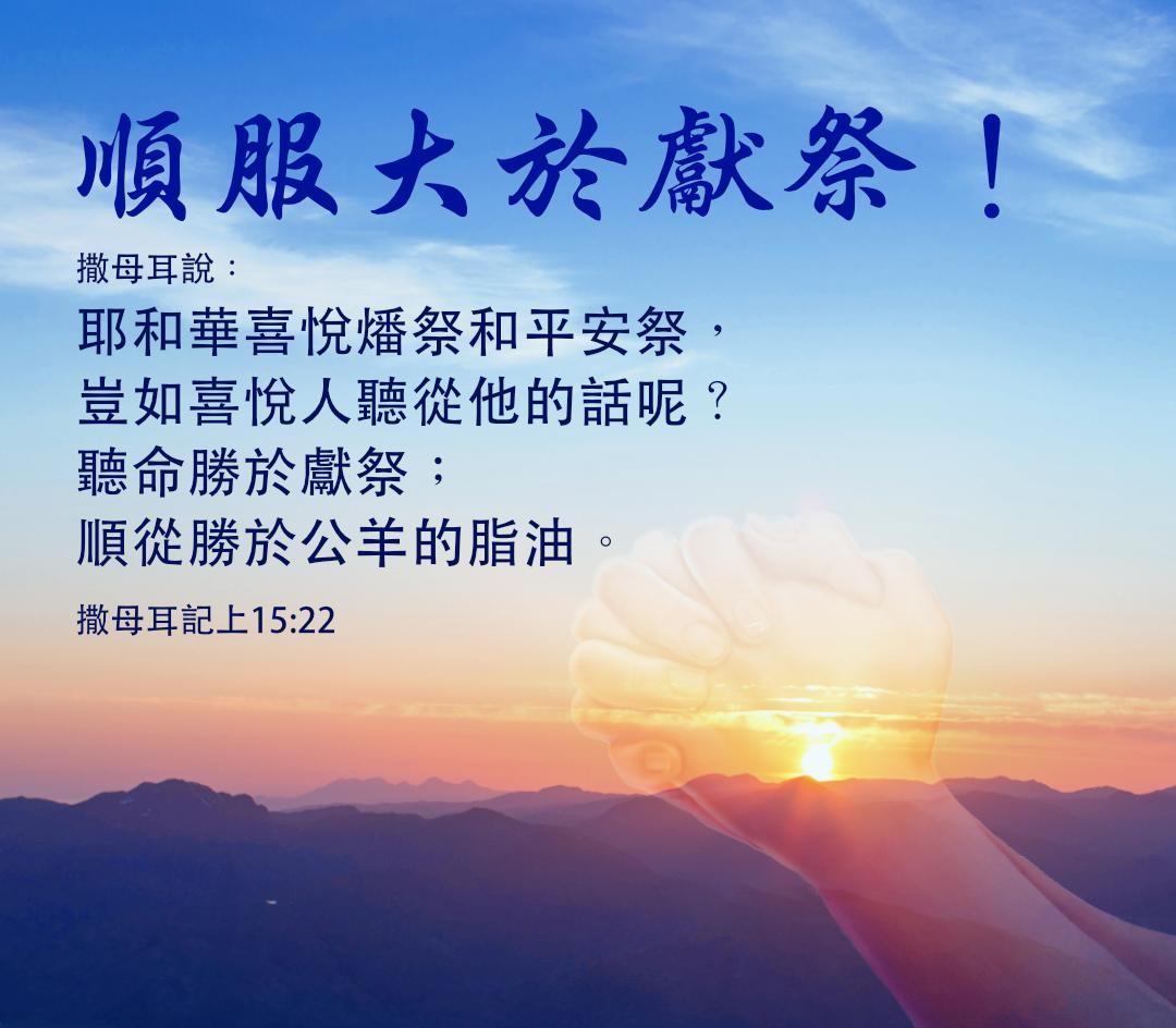 今日经文:“耶和华喜悦燔祭和平安祭,岂如喜悦人听从祂的话呢?听命胜于献祭,顺从胜于公羊的脂油。悖逆的罪,与行邪术的罪相等,顽梗的罪,与拜虚神和偶像的罪相同。”(撒上15:22-23)