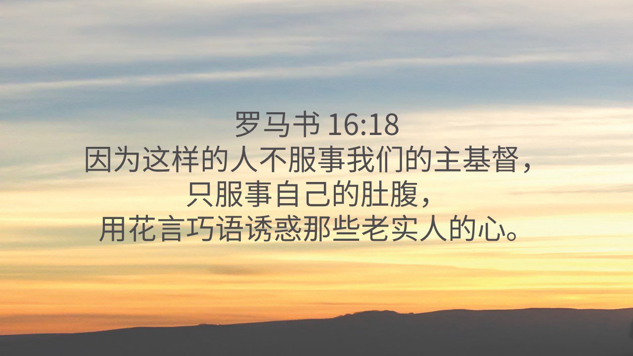 “17弟兄们,那些离间你们、叫你们跌倒、背乎所学之道的人,我劝你们要留意躲避他们。18因为这样的人不服事我们的主基督,只服事自己的肚腹,用花言巧语诱惑那些老实人的心。”(罗马书16:17-18)