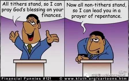 (上图来自网络。漫画:牧师对会众(左图):凡是十一奉献的请站起来,我为你们祷告求神在金钱上祝福你们!(右图):现在凡不能十一奉献的站起来,我带领你们做悔改的祷告!)