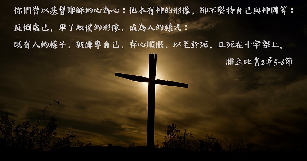 主耶稣“本有神的形象,不以自己与神同等为强夺的,反倒虚己,取了奴仆的形象,成为人的样式。既有人的样子,就自己卑微,存心顺服,以至于死,且死在十字架上”(腓立比书2:6-8)。