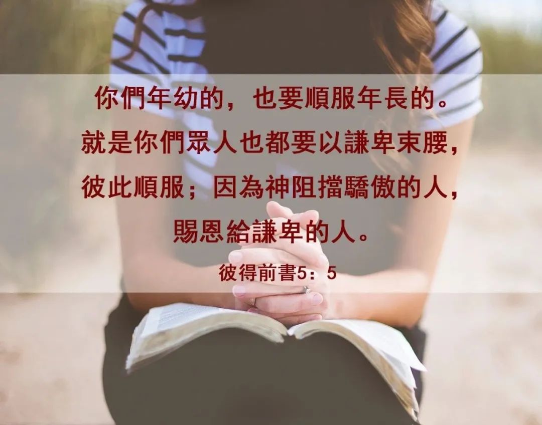 “你们年幼的要顺服年长的。就是你们众人也都要以谦卑束腰,彼此顺服;因为‘神阻挡骄傲的人,赐恩给谦卑的人。’所以你们要自卑,服在神大能的手下,到了时候,祂必叫你们升高。”(彼前五5-6)