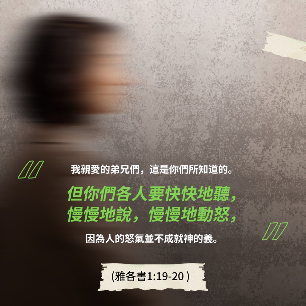 “你们各人要快快的听,慢慢地说,慢慢的动怒。”(雅一19)