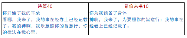 根据希伯来书可知,这个关乎基督的预言,是一个完整的福音真理,是神全备救恩的预言。那是基督(我)跟神(你)之间的对话,讲论关于基督来到世上的事情。不过经文引用有些许不同,比较如下: