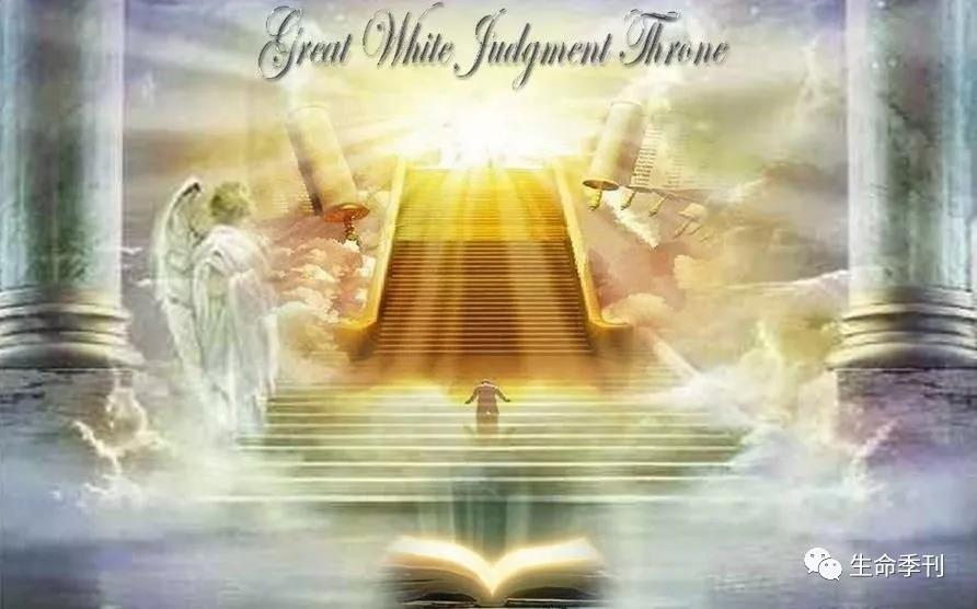 启20:11-15:“我又看见一个白色的大宝座与坐在上面的,从祂面前天地都逃避,再无可见之处了。我又看见死了的人,无论大小,都站在宝座前。案卷展开了。并且另有一卷展开,就是生命册。死了的人都凭着这些案卷所记载的,照他们所行的受审判。于是海交出其中的死人,死亡和阴间也交出其中的死人。他们都照各人所行的受审判。死亡和阴间也被扔在火湖里,这火湖就是第二次的死。若有人名字没记在生命册上,他就被扔在火湖里。”