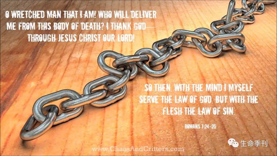 “21我觉得有个律,就是我愿意为善的时候,便有恶与我同在。22因为按着我里面的意思,我是喜欢神的律。23但我觉得肢体中另有个律和我心中的律交战,把我掳去,叫我附从那肢体中犯罪的律。”“25这样看来,我以内心顺服神的律,我肉体却顺服罪的律了。”(7:21-23,25)