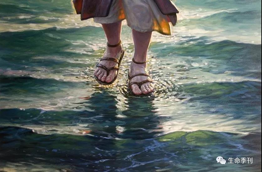 福音书记载,耶稣用五饼二鱼喂饱五千人,众人要强迫祂做王。耶稣便吩咐门徒开船到海那边去,自己一个人上山去祷告。深夜四更天的时候,耶稣在海面上走,要走到门徒那里去。门徒看见祂,以为是鬼怪便害怕。耶稣对他们说,“是我,不要怕!”