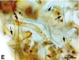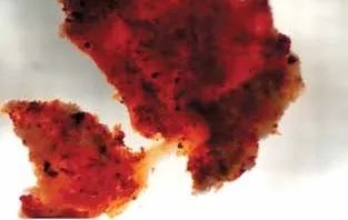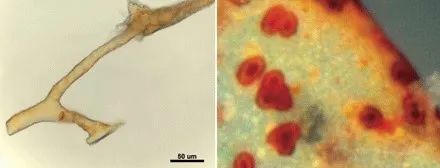霸王龙的骨骼内发现柔软有分支的血管(左)其中的红细胞(右)