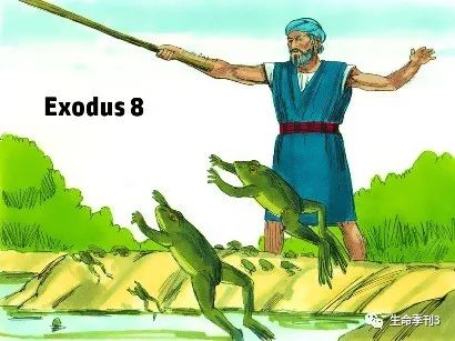 “耶和华晓谕摩西说:你对亚伦说:把你的杖伸在江、河、池以上,使青蛙到埃及地上来。亚伦便伸杖在埃及的诸水以上,青蛙就上来,遮满了埃及地。行法术的也用他们的邪术照样而行,叫青蛙上了埃及地。”(8:5-7)