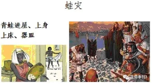 水变血之灾平息了,尼罗河河水恢复正常,神让河里面滋生无数的青蛙,神要如何用青蛙来惩罚埃及呢?神的作为是要让这些青蛙离开河,去几个地方: