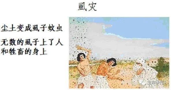 “耶和华吩咐摩西说:你对亚伦说:伸出你的杖击打地上的尘土,使尘土在埃及遍地变作虱子(或作虼蚤下同)。他们就这样行。亚伦伸杖击打地上的尘土,就在人身上和牲畜身上有了虱子;埃及遍地的尘土都变成虱子了。行法术的也用邪术要生出虱子来,却是不能。于是在人身上和牲畜身上都有了虱子。行法术的就对法老说:这是神的手段。法老心里刚硬,不肯听摩西、亚伦,正如耶和华所说的。”(8:16-19)