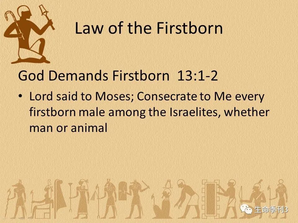 神吩咐最重要的一点,就是长子一定要赎出来。五舍客勒银子相当于一个月的工资,这就是赎价。到了新约时代开始,大卫的子孙约瑟和马利亚也继续遵守这个神的命令,他们把婴孩耶稣带到圣殿,按照规矩分别为圣献给神。