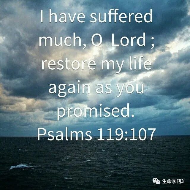 诗篇119:107,“我甚是受苦,耶和华啊,求你照你的话将我救活”,是诗人对“受苦”被神“救活”这个话题的重述。但这一次,诗人则说他“甚是受苦”,也就是说,他所受的苦难,大到了难以形容的程度。