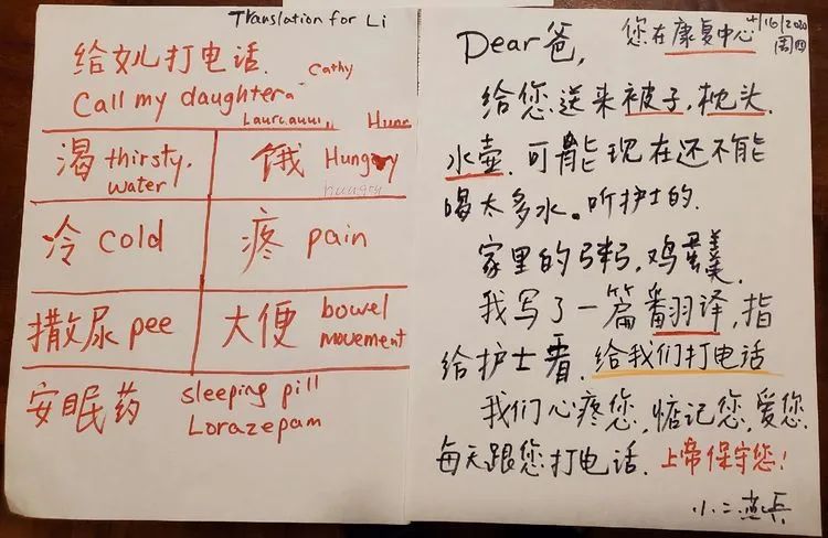 这是爸爸住进康复中心第一天的时候给他写的信,和一些基本用词的中英翻译对照。他可以指着中文,让护士护工看英文。