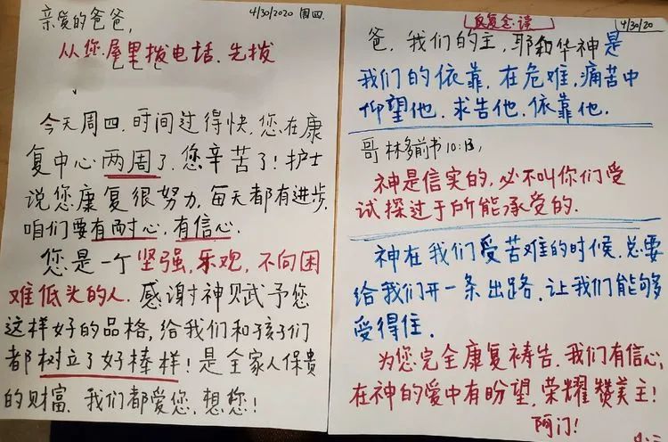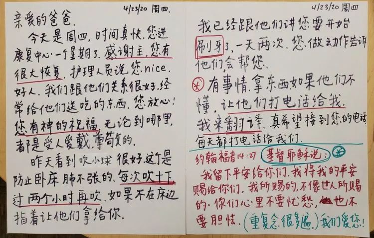 自从爸爸在医院里拔管清醒以后,我每天给爸爸写信。我很珍惜这个写信的过程,这样的交流是我能为他做的不多的事情之一。在信里我告诉爸爸日期、病情的进展、治疗方案等等。最重要的是我每天给爸爸写圣经的经文和祷告,用上帝的话语来鼓励他,告诉他我们爱他,神爱他,一定要坚持住。爸爸每天也非常期待我的信。