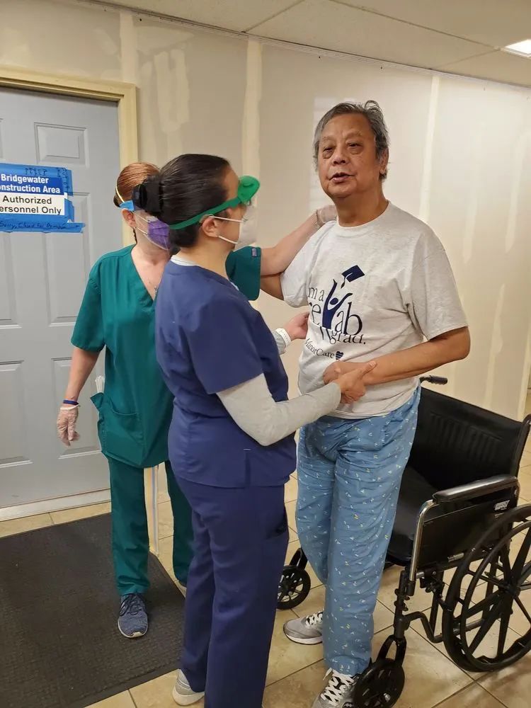 到康复中心第二周的时候,爸爸可以在别人的搀扶下站立起来了。康复中心的营养师每天给爸爸做吞咽实验,慢慢从吃流食进步到吃软食,然后逐渐吃正常饮食。精神状态也越来越好。