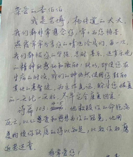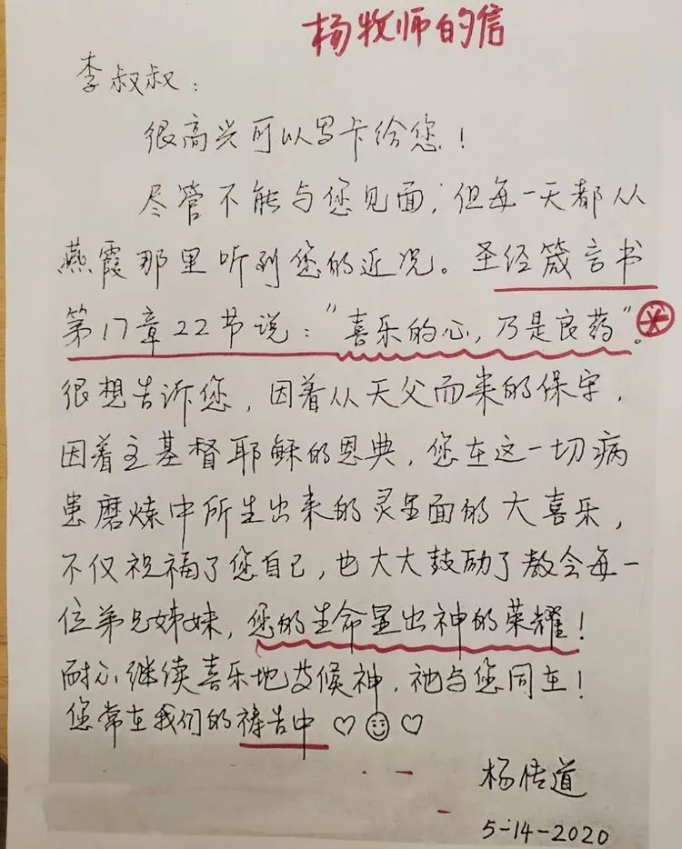 上面是我们教会杨牧师给爸爸的信。箴言17:22 喜乐的心,乃是良药;忧伤的灵,使骨枯干。