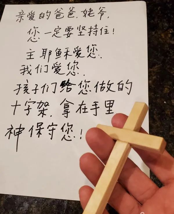 插管第八天的时候,我写了一封信给爸爸,和大儿子做的一个小十字架一起送到医院去。感谢神听我们的祷告,次日(4月7日)就可以拔管了。9天就成功拔管,这已经是奇迹了。