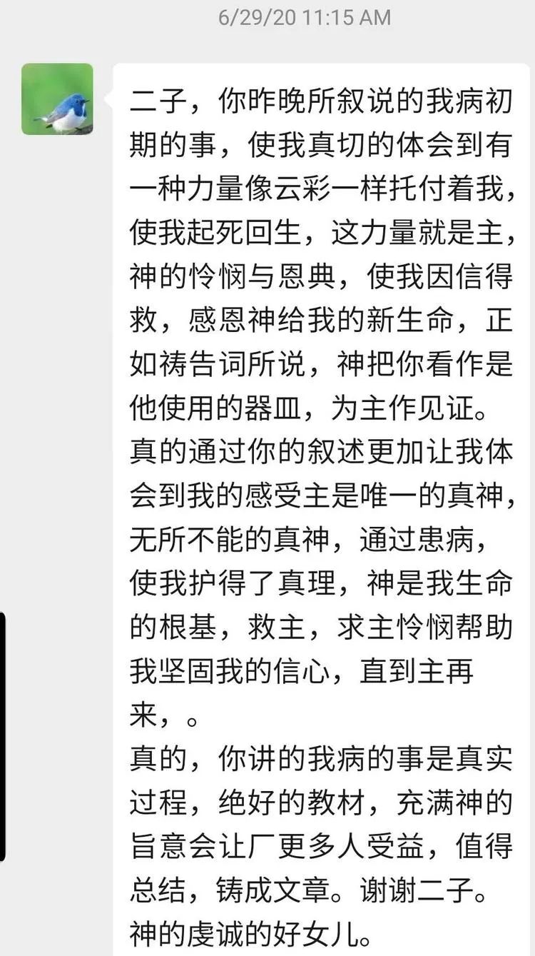 爸爸逐渐能够吃东西了,声带也有一点点恢复。电话放在他耳边能够听见,他以很弱的声音说“谢谢”,“辛苦了”。爸爸是一个很坚强很感恩的人,虽然见不到他,我感觉到他的头脑还是清楚的,我心里有很大的平安。我经常翻开圣经,神的话语给我莫大的鼓励。我不停地回想一路走过来,最艰难的时候得到那么多神的恩典,上帝会继续赐福我们,要有信心。