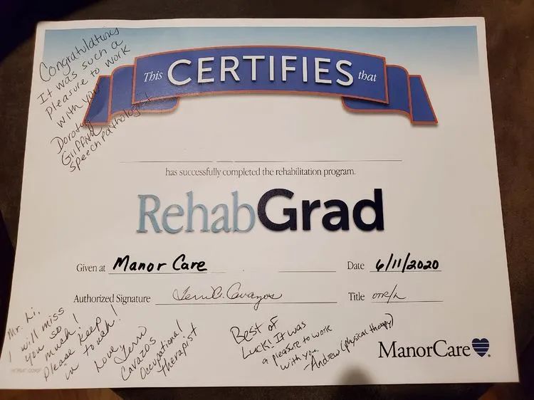 康复师们颁发给爸爸的“毕业证书”。上面有他们的签名和祝愿。