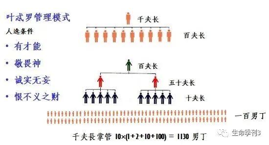 摩西、亚伦和长老是领导阶层,他们以下的组织架构有四层,是四种职位的人:千夫长、百夫长、五十夫长和十夫长。千夫长管十个百夫长,百夫长管两个五十夫长,五十夫长带五个十夫长,每个十夫长管十个人,“夫”这个字就是指男人,所以总计千夫长管辖1130个男人;从数目上来看,百姓出埃及共六十万男人,以色列人是以男性为主的社会,都是以男丁来计算人口数目,所以摩西需要先选出大约530位千夫长,相当于每个支派选出40多位千夫长,然后由他们向下选出各阶层的管理人员。