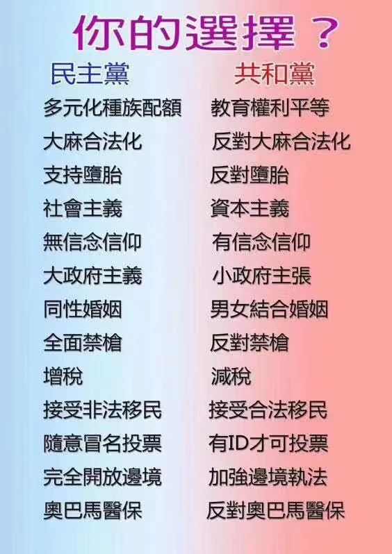 有许多归化的美国人,就像美籍华人,都认为这不是我们的事,我们来到这个黄金王国,是为了过上好一点的日子,儿女能上好的学校,我能挣多一点钱,有点安全感就行了,其他管不了那么多。就这样,我们在我们的所在国,所在的社会的一切动态,都采取不闻不问的态度,然后我们会抱怨说,这个国家这个社会怎么成了这个样子?那是因为我们对国家社会漠不关心的缘故。美国的大选在即,需要我们投下神圣的一票。你或许会说,我这一票算什么?我要投谁呢?我的看法是,不是投谁,而是投什么?Not Who, but what?美国是共和国体,民主政体,总统四年一选,有两大重要政党,有民主党又称驴党,有共和党又称象党。两党都有一定的政纲,他们的总统候选人参与其党的政钢制定,也就是说党的政纲是总统候选人所认可接纳的。这样,我们就不是选哪一个人,而是选哪一个人所持的政纲是什么。美国虽然在立国的时候,有很多基督徒在其中,也有一位牧师在独立宣言上签字,但美国不是基督教国家,更谈不上神治政体,所以,各党的政纲有很多立场是不合圣经真理的,因此,我们找不到完全符合圣经的政纲,这样我们就必须在两者之间,找寻比较接近或比较符合圣经的政纲。例如: