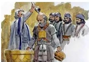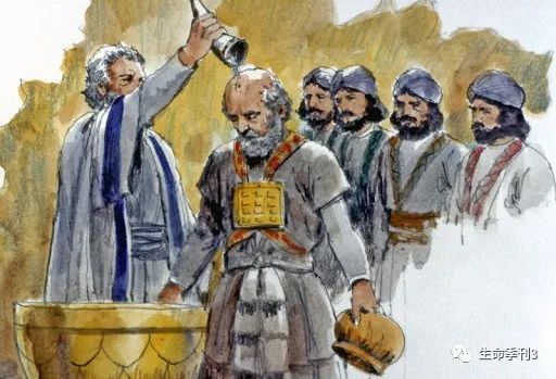 “要使亚伦和他儿子到会幕门口来,用水洗身。要给亚伦穿上内袍和以弗得的外袍,并以弗得,又带上胸牌,束上以弗得巧工织的带子。把冠冕戴在他头上,将圣冠加在冠冕上,就把膏油倒在他头上膏他。要叫他的儿子来,给他们穿上内袍。给亚伦和他儿子束上腰带,包上裹头巾,他们就凭永远的定例得了祭司的职任。又要将亚伦和他儿子分别为圣。”(出埃及记29:4-9)