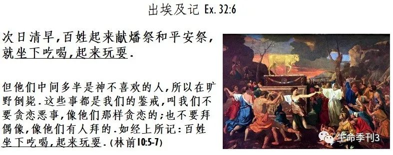 “但他们中间多半是神不喜欢的人,所以在旷野倒毙。这些事都是我们的鉴戒,叫我们不要贪恋恶事,像他们那样贪恋的;也不要拜偶像,像他们有人拜的。如经上所记:百姓坐下吃喝,起来玩耍。”(林前10:5-7)