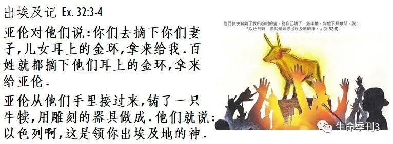 “亚伦对他们说:你们去摘下你们妻子、儿女耳上的金环,拿来给我。百姓就都摘下他们耳上的金环,拿来给亚伦。亚伦从他们手里接过来,铸了一只牛犊,用雕刻的器具做成。他们就说:以色列啊,这是领你出埃及地的神。”(32:3-4)