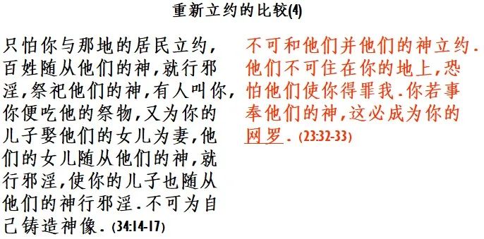 23:32-33约中禁止百姓跟迦南人立约,也禁止向偶像立约,不可委身去事奉偶像神明,分到的产业不可以让迦南人居住,因为跟迦南人住在一起一定会受到引诱,落入他们迷信的网罗。这次立约把那个抽象的网罗,用实际举例来说明,例如受邀去吃偶像的祭物就是一种网罗。行邪淫祭祀偶像会是怎么开始的呢?如果以色列人的儿子去娶迦南人的女子为妻,他们就会跟着妻子去行邪淫,事奉偶像,甚至自己也去铸造偶像,自己拜或是给别人拜。所以这些实际的行为在这次约中都明令禁止。