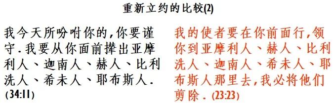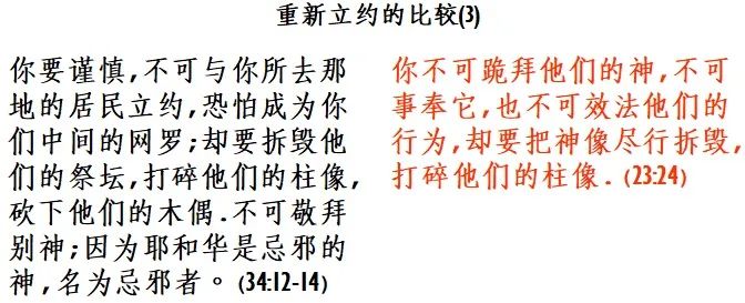 最后,23:18-19所列有关献祭祭物的规定也是完全一样,这次立约没有改变。前一次在山上神吩咐许多有关会幕圣物祭司条例等的事情,以及更早提出其它的典章细则,这一次并没有列出,表示全部都沿用,都不更改。