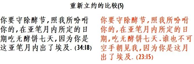 对照23:15逾越节除酵节的日期和吃无酵饼的规定,这次立约没有改变,只是把“不可空手朝见神”并到下面头生代赎的规定。