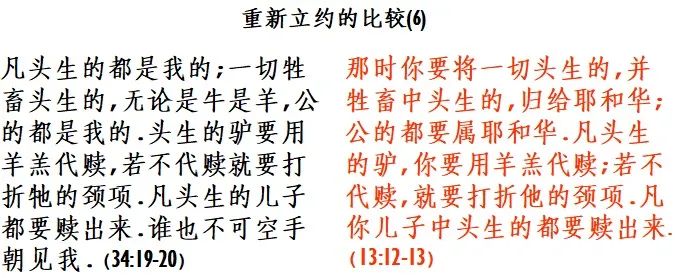 将头生的献给耶和华和头生的驴和头生的儿子都要代赎的規定,是在13章出埃及时神定规的,这次重新立约神把这项规定增列进来。