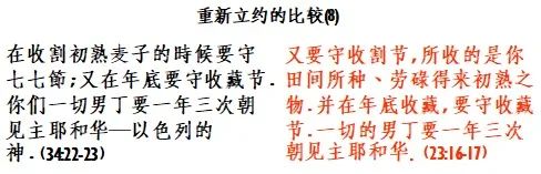 对照23:16-17,一年三次守节的规定也是再次提出,除酵节、收割节和收藏节的节期都没有改变,特别强调了男丁一定要去朝见神,不是外邦神,是主耶和华--以色列的神。
