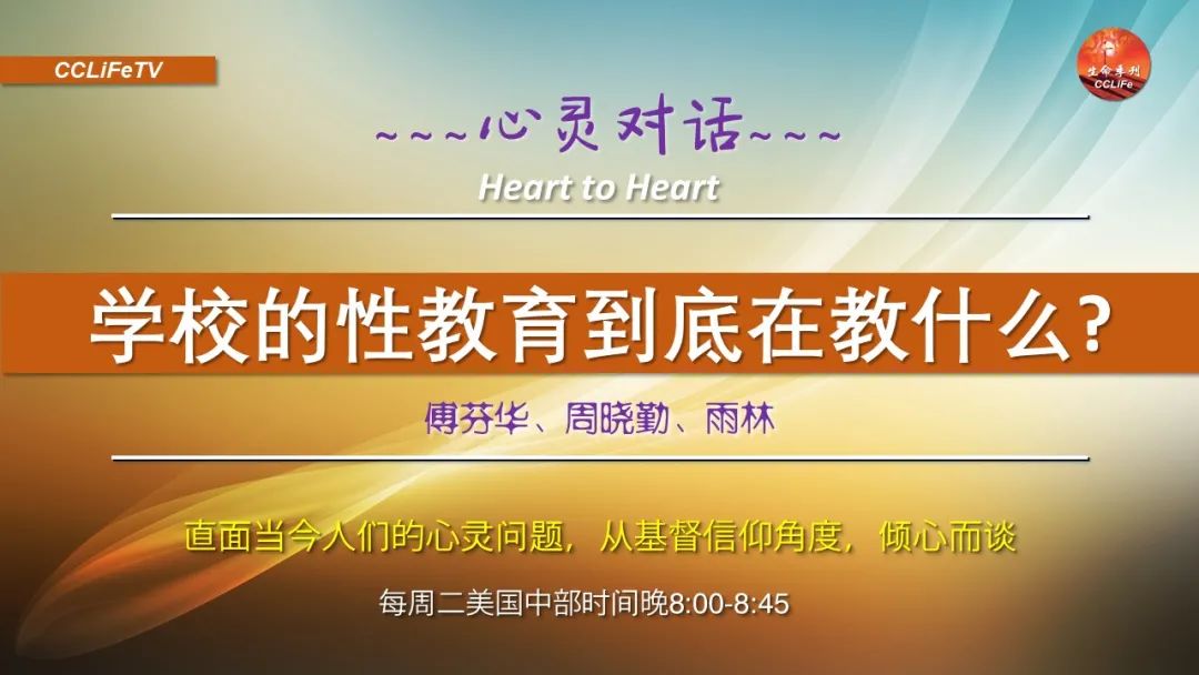 晓勤和芬华的孩子都是在美国接受教育,晓勤说在16年前她的儿子的学校通知家长,他们将会有性教育课程提供给孩子,她就要求知道提供性教育的人是谁、内容是什么。结果得知原来课程是由美国的堕胎组织Plan Parenthood的专家来提供的。晓勤知道这个组织的经费来源主要是靠帮助女性堕胎而来,很多未成年的少女跟成年男子发生了性行为怀孕以后也是到他们那里去堕胎,这是一个道德非常败坏的自由派组织,学生们的性教育怎么可以由他们来教导呢?校方给晓勤看到他们的教导内容更是让她大吃一惊,里面都是一些逆性的性交姿势,怎么可以让青少年学生学习这些东西呢?最后在晓勤的强烈反对下,学校提出晓勤的孩子可以不上这堂课,可以离开这个学校。晓勤马上让孩子退学,全家搬到另外一个比较保守的学区继续上学。