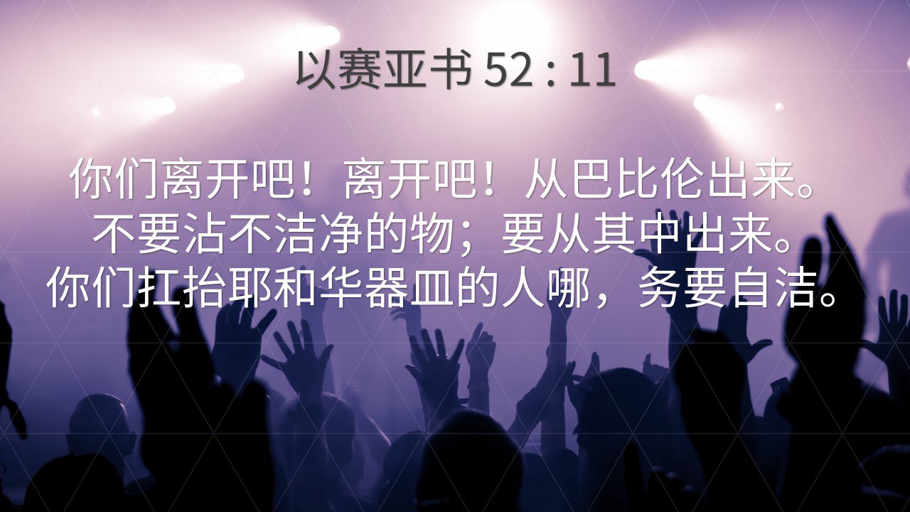 “你们离开吧!离开吧!从巴比伦出来,不要沾不洁净的物;要从其中出来。你们扛抬耶和华器皿的人哪,务要自洁!”