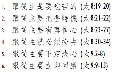 在马太福音8:18-9:13节,马太记载了六件关于跟从主的事情,有不同的人,不同的事情和结果,其中耶稣所说的话,所行的神迹就围绕在跟从主这个主题。