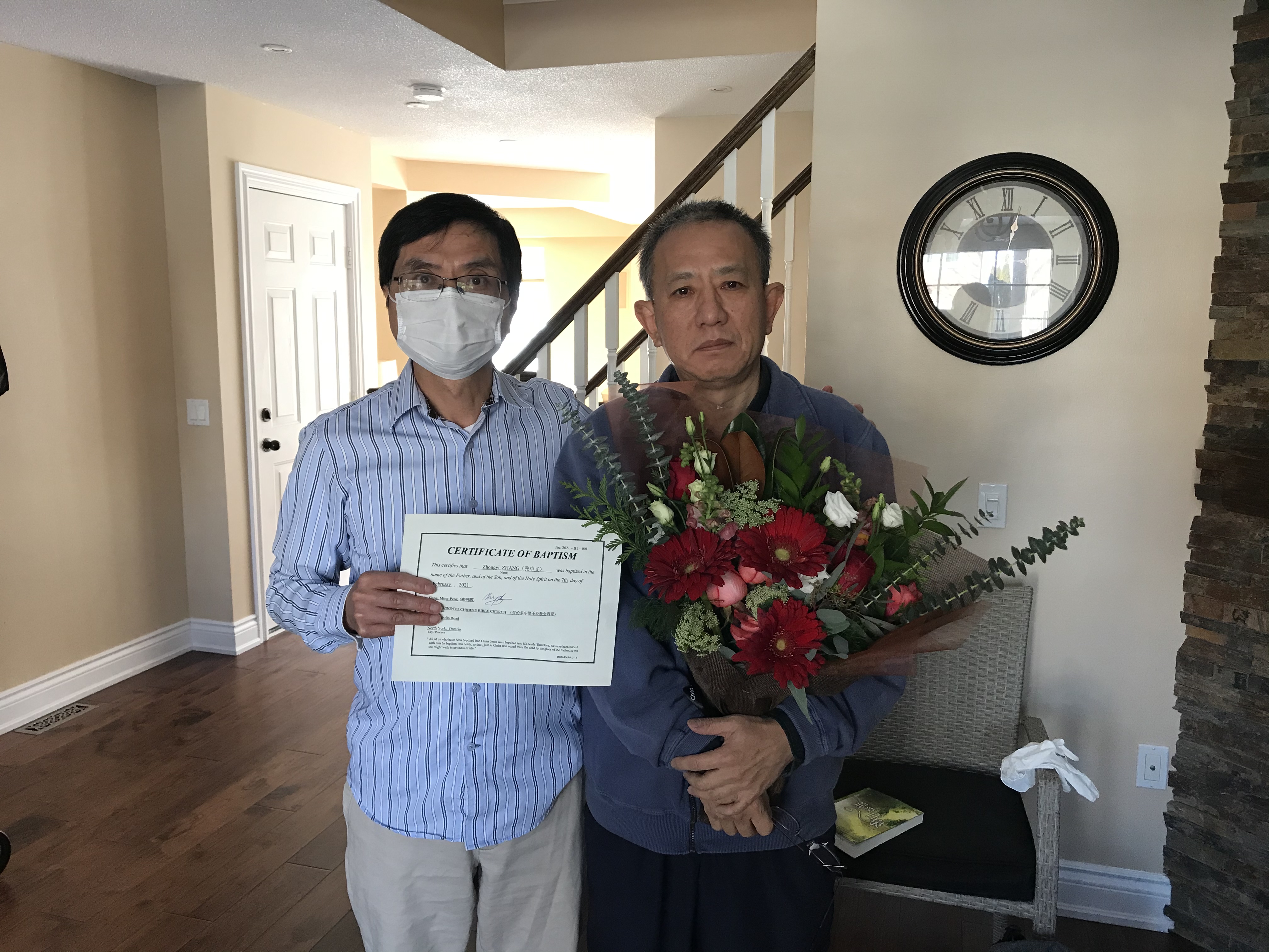 后来我想到了受洗的事,所以就准备在我们多伦多当地找一个华人牧师。在我找牧师时,窦伟姊妹向我推荐了龚明鹏牧师,同时钱姚南弟兄也向我推荐了龚明鹏牧师,这难道只是个巧合?就这样,10月22日,龚牧师来到我家,我记得那时我只能躺在躺椅上见龚牧师。他给我带来了圣经,给我讲了他的见证,我对他讲的见证深信不移。龚牧师还特别有信心,说我的病只要坚定信主就没问题,并为我做按手抹油祷告。